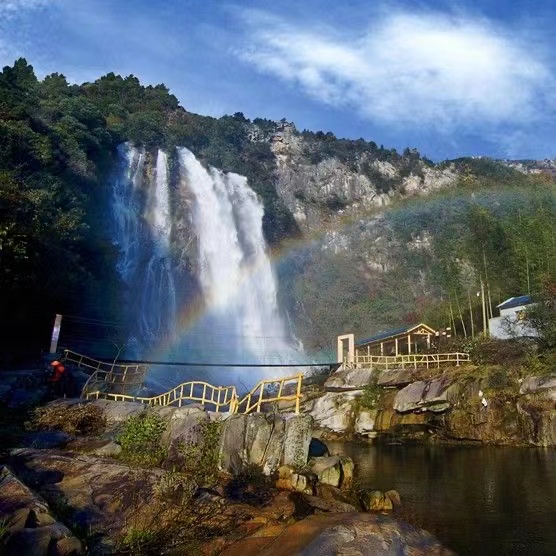 彩虹瀑布:位于猴河中下游,瀑布高80米,寬25米,平均流量2.0至5.0立方米/秒,水流自猴子崖飛泄而下,氣勢(shì)磅礴,吼聲如雷。站在不同方位觀景臺(tái)上看到清澈的河水撞擊堅(jiān)石,水花四濺,猶如噴霧行云,陽(yáng)光透過(guò)水霧,呈現(xiàn)一道絢麗的彩虹。由于猴河集雨面積達(dá)60多平方公里,平均海拔超千米,雨量充沛,四季不涸,無(wú)論春夏秋冬皆有瀑布景觀。